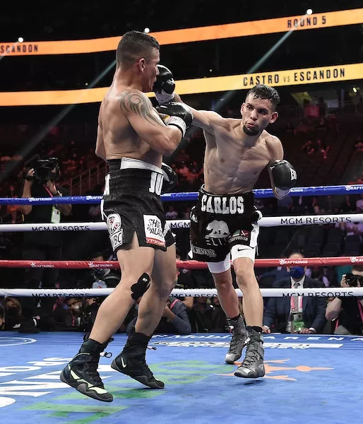 Escandón y Castro se probaron entre sí con golpes sólidos en el primer round. Escandón atacó por dentro haciendo retroceder a Castro contra las cuerdas desde el principio. En el cuarto, Castro disparó una derecha recta que rompió la cabeza de Escandón. Boxeando en el quinto, Castro rodeó el ring mientras Escandón acechaba en busca del golpe de poder.