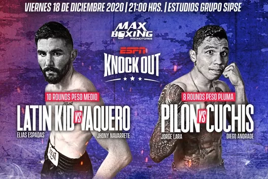 El mexicano Elías Espadas (19-4-0, 14 ko’s), que apenas el mes pasado noqueó a Darío Ferman, tendrá un duro compromiso, a 10 rounds en peso Medio, ante el experimentado, Jhonny “Vaquero” Navarrete (34-17-2, 15 ko’s), en un duelo estelar que se realizara el próximo viernes, 18 de diciembre, en las instalaciones de Grupo Sipse en Mérida, Yucatán, México.