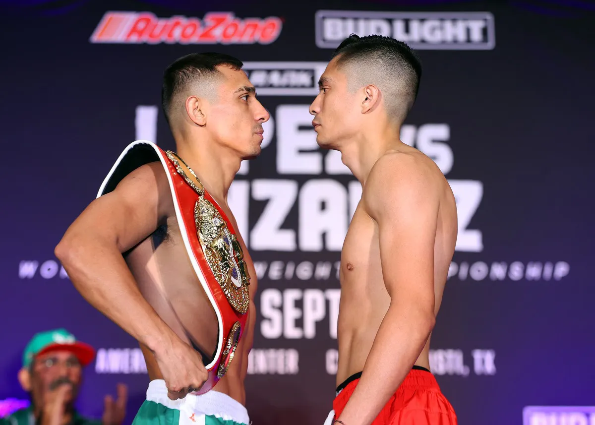 González subió a la báscula en 126.4 libras para su pelea contra López, quien llegó muy por debajo del límite de peso pluma, 125.2 libras, para su segunda defensa de un cinturón de la FIB que ganó cuando venció a Josh Warrington por decisión mayoritaria el 10 de diciembre pasado en la ciudad natal de Warrington, Leeds, Inglaterra.