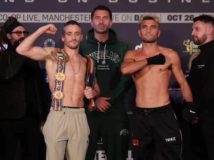 Diego Pacheco y Kevin Lele Sadjo dan el peso antes del choque de 168 libras que será el estelar de una cartelera que Matchroom Boxing organizará este sábado